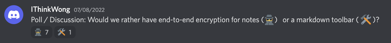 Privacy and security are a big concern for many users. Especially with something as personal as note-taking this is doubly important. In a survey within my discord channel, for every person that wanted markdown support in Fleeting Notes, 7 people wanted end-to-end encryptionend-to-end encryptionEnd-to-end encryption (E2EE) is a method of secure communication that prevents third parties from accessing data while it's transferred from one end system or device to another. Source: https://www.techtarget.com/searchsecurity/definition/end-to-end-encryption-E2EE#:~:text=End%2Dto%2Dend%20encryption%20(E2EE)%20is%20a%20method,intended%20recipient%20can%20decrypt%20it.. With such high demand for E2EEend-to-end encryptionEnd-to-end encryption (E2EE) is a method of secure communication that prevents third parties from accessing data while it's transferred from one end system or device to another. Source: https://www.techtarget.com/searchsecurity/definition/end-to-end-encryption-E2EE#:~:text=End%2Dto%2Dend%20encryption%20(E2EE)%20is%20a%20method,intended%20recipient%20can%20decrypt%20it., I had no choice but to work hard to add this crucial feature into the application.