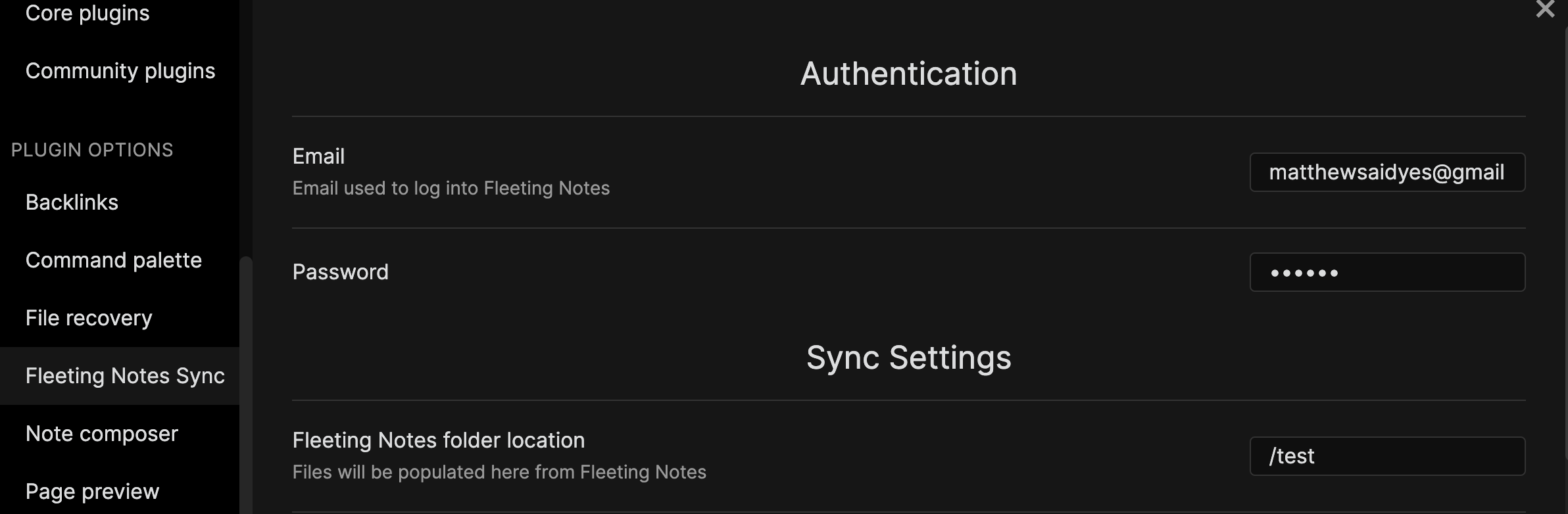 Once enabled click "Fleeting Notes Sync" under Plugin Options > Fleeting Notes Sync. Under here, fill in your username, password, and desired folder location to sync your notes.