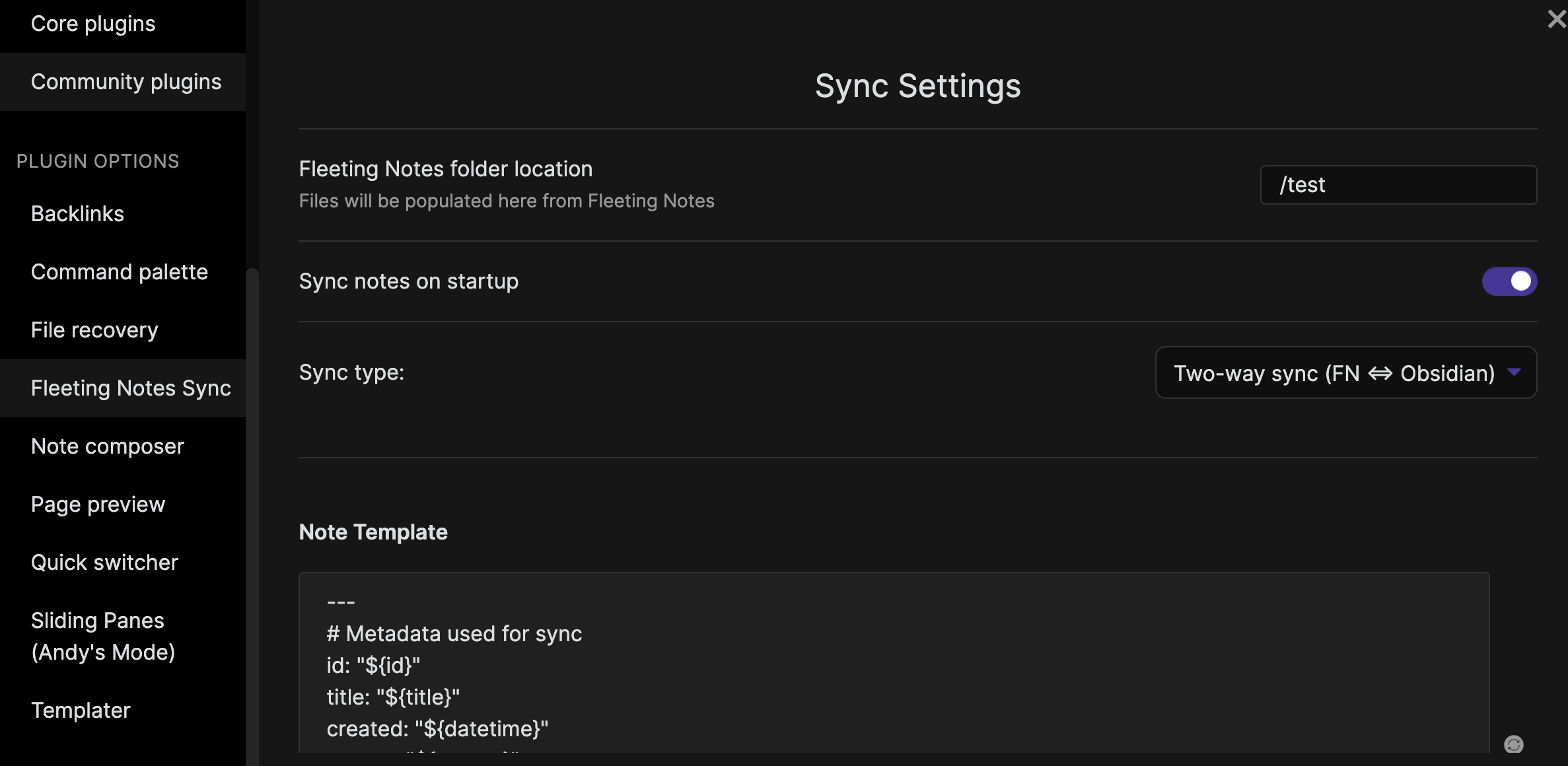 Now that you have your notes synced, see how I process my Fleeting NotesHow I take Fleeting Notes with ObsidianI get a lot of questions asking how I process Fleeting Notes once they land in Obsidian. There are many ways to approach this but here's the best method I found for myself. 1. Setup Obsidian sync with Fleeting Notes 1. Install the Obsidian Dataview plugin 1. Enable the Daily Notes plugin in the Obsidian settings (Also, check out how I use daily notes in Obsidian) 1. Create a template file for the daily notes, and add the path of the file to the Template file location 1. Here's the template I us and how to sync Obsidian links into Fleeting NotesHow to Sync Obsidian [[links]] into Fleeting Notes1. Install the Obsidian plugin (v0.5.2+) Browse Community Plugins 1. Go to the plugin settings and login to the account you setup within Fleeting Notes 1. Scroll to the bottom of the settings page and enable "Sync Obsidian [[links]] to Fleeting Notes" sync-obsidian-links.png 1. Once you've enabled it, in Fleeting Notes you should see a new note titled "Links from Obsidian" within the Fleeting Notes app. links-from-obsidian.png 1. Now whenever you type [[ , you will get the same link sug